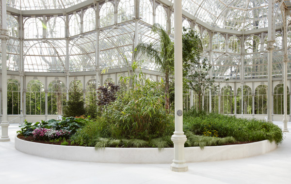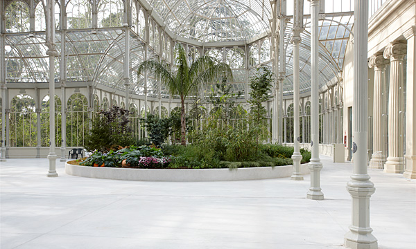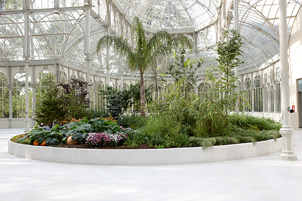 "La saison des fêtes" de Pierre Huyghe se ha concebido especialmente para este espacio (actualmente reservado a proyectos de arte dirigidos por el Museo Reina Sofía), y se enmarca libremente en la historia y los antiguos usos del Palacio. Si detrás de la exposición original de exuberantes plantas tropicales había una ideología colonialista, la obra de Huyghe, en cambio, intenta alejarse de una postura estrictamente eurocéntrica. El paisaje visionario que ocupa el centro del luminoso pabellón tiene una huella circular, tal vez aludiendo a la forma esférica de la Tierra, o quizás evocando un instrumento temporal –como la esfera de un reloj— que marcase la sucesión cíclica de días, meses y estaciones. Las plantas que incluye este paisaje se asocian a festividades y celebraciones populares de todo el mundo –rosas rojas de San Valentín, calabazas de Halloween, cerezos en flor que señalan el inicio de la primavera. Huyghe espera que en ese cosmos utópico todo pueda florecer al mismo tiempo (en algún momento de la exposición) y amalgama fechas dispares, diseminadas intermitentemente por el calendario anual, en una festividad combinada –“un ramillete de efemérides”–, de modo que la gente de todas partes del mundo podría reunirse y hacer causa común. La sustitución de las suntuosas butacas que decoraban la tarima en este edificio cuando se inauguró en 1887 por las ordinarias sillas de plástico que Huyghe ofrece a los espectadores para contemplar colectivamente la escena, para observar a los demás visitantes y ese espacio fantástico, muestra un ethos radicalmente distinto: invita a los espectadores a volverse cómplices y autorreflexivos. La sensación de plenitud y placer que genera el jardín de Huyghe puede lograr que los espectadores hagan causa común, mientras comparten esta experiencia maravillosa y a la vez extrañamente inquietante. Un flujo de algo grotesco subyace dentro de este idílico jardín, que puede, además, suscitar una reflexión sobre el modo en que las conmemoraciones se han asociado estrechamente no sólo a los recuerdos, sino a los objetos, naturales y artificiales. Las fuerzas económicas se infiltran cada vez más en las costumbres culturales, intensificándolas artificialmente e inflando su valor comercial. Dadas las formas sutiles de conformidad social que refuerzan tales presiones económicas, cada vez es más difícil sustraerse a todo eso y negarse a participar en las series incansables de fechas festivas que ahora puntúan y definen el calendario del año.