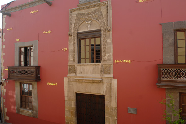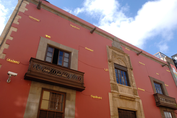 En la fachada principal de la calle Balcones, 9 sede administrativa del CAAM, establecida en una casa-palacio del siglo XVI del barrio de Vegueta, Joseph Kosuth presenta la instalación "14 Lugares del Significado / "14 Locations of Meaning". Esta pieza forma parte de una serie de instalaciones con el mismo nombre presentada desde el año 2000 en diferentes lugares del mundo: Italia, Bosnia-Herzegovina, Emiratos Arabes. La palabra "significado" muy relevante en la reflexión planteada en la obra de Kosuth, se reproduce en 14 idiomas diferentes, mediante luces de neón. Según el artista, el significado de las palabras, imágenes, códigos o representaciones, cambia sustancialmente en función del contexto en el que éstos se presenten, poniendo de este modo en entredicho el sistema representativo y de reproducción. La serie "Lugares del significado" se adapta al contexto en el que la pieza se muestra, insertando aquellos idiomas asociados con la cultura e historia de cada uno de los lugares en los que la pieza se ha expuesto. En el caso de "14 Lugares del Significado / "14 Locations of Meaning" presentada en las Palmas de Gran Canaria, esta pieza reproduce la historia multicultural de la isla, caracterizada por los intercambios culturales producidos a lo largo de los siglos con el paso de entre otros, ingleses, italianos, alemanes, franceses, judíos, árabes, japoneses, etc. Como representación de una de las migraciones actuales, Kosuth ha incorporado la palabra "significado" en wolof, idioma hablado en Senegal, Mauritania y Gambia, algunos de los países más afectados por la inmigración irregular hacia las Islas Canarias.