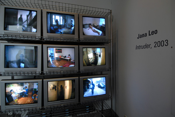 Intruder (2003) de Jana Leo es una instalación compuesta por nueve monitores situados en una estantería que simulan y recuerdan, por su colocación y apariencia, un panel de monitores de un sistema cerrado de video vigilancia. A través de las imágenes el espectador se sitúa en la posición del voyeur ya que en las pequeñas pantallas puede seguir las actividades cotidianas que ejecuta el inquilino de un piso. Aparece sin embargo, de forma puntual, otro personaje con el rostro cubierto con un pasamontañas que activa una posible situación de peligro. El visitante no es tan sólo voyeur de unas situaciones cotidianas sino de una situación de peligro, ante la cual no puede ser otra cosa más que espectador.
