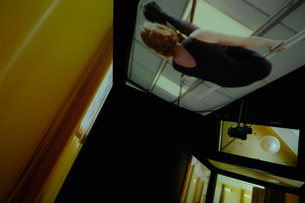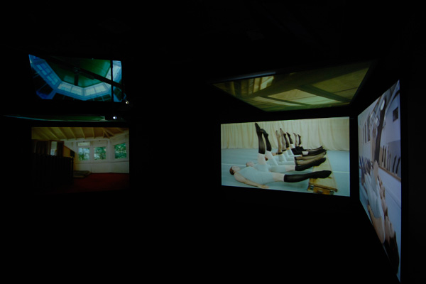 En las tres instalaciones realizadas por Jonas Dahlberg, Jana Leo y Jane & Louise Wilson respectivamente, el espectador se halla ante representaciones audiovisuales de espacios que experimenta a través de un viaje, de un recorrido compuesto por una sucesión de imágenes ordenadas y articuladas. Asimismo, cada una de las instalaciones ocupa el espacio expositivo de una forma singular que conllevará una experiencia física y psicológica diferenciada por parte del espectador. Las obras corresponden a artistas que integran en su trabajo una noción de espacio flexible, fluido, permeable y capaz de adherir experiencias. Las representaciones espaciales que construyen a partir de medios audiovisuales se articulan entorno a recorridos, a viajes a través de arquitecturas, que a menudo se plantean como imposibles en la realidad física. El título a través de paredes alude precisamente a un movimiento en el espacio totalmente imposible en la realidad –si exceptuamos la práctica de Gordon Matta-Clark- pero factible y de hecho muy recurrente en el cine, como es el hecho de atravesar paredes y estancias mediante un plano secuencia o travelling, conectando de ese modo espacios físicamente separados.